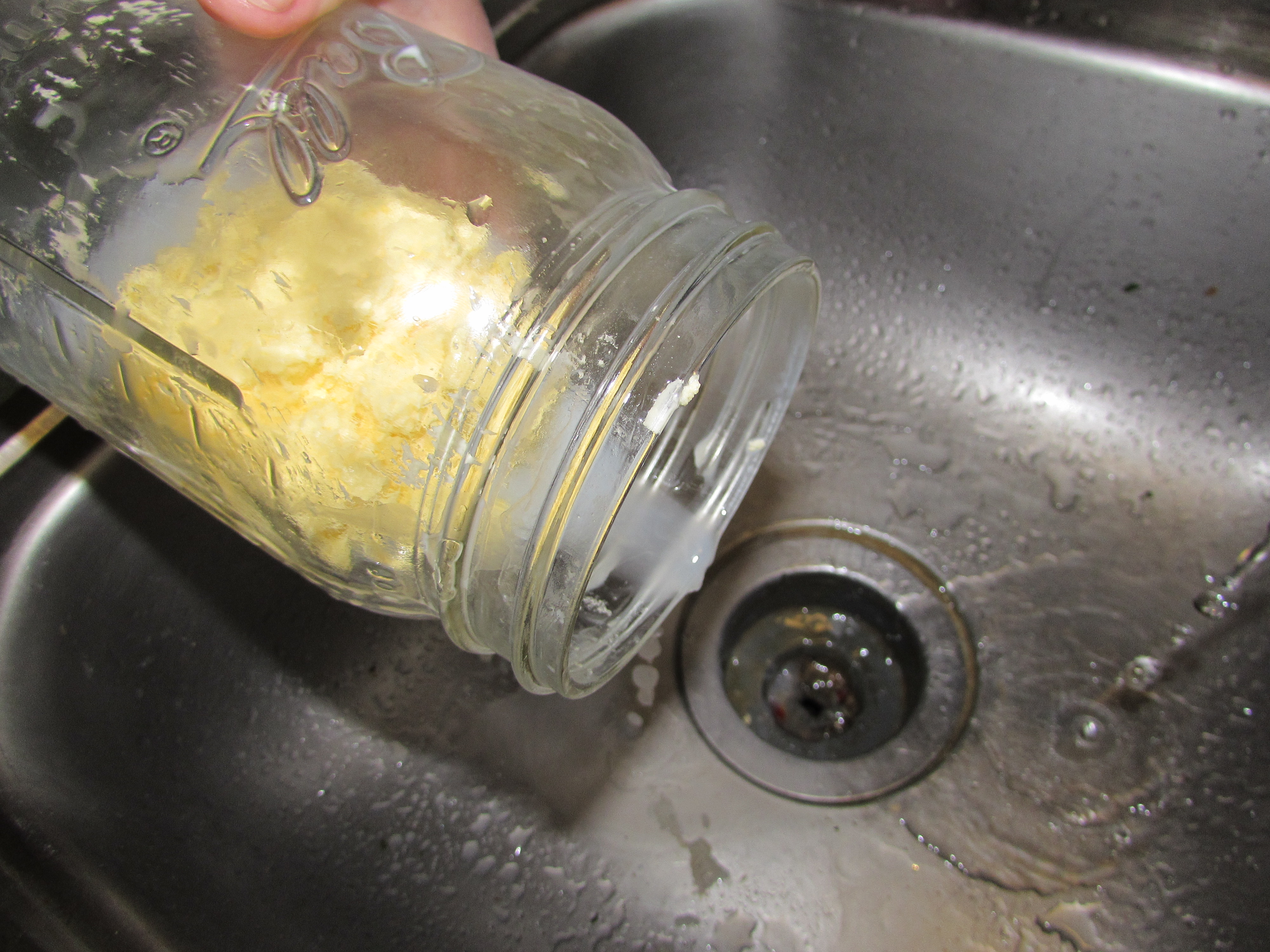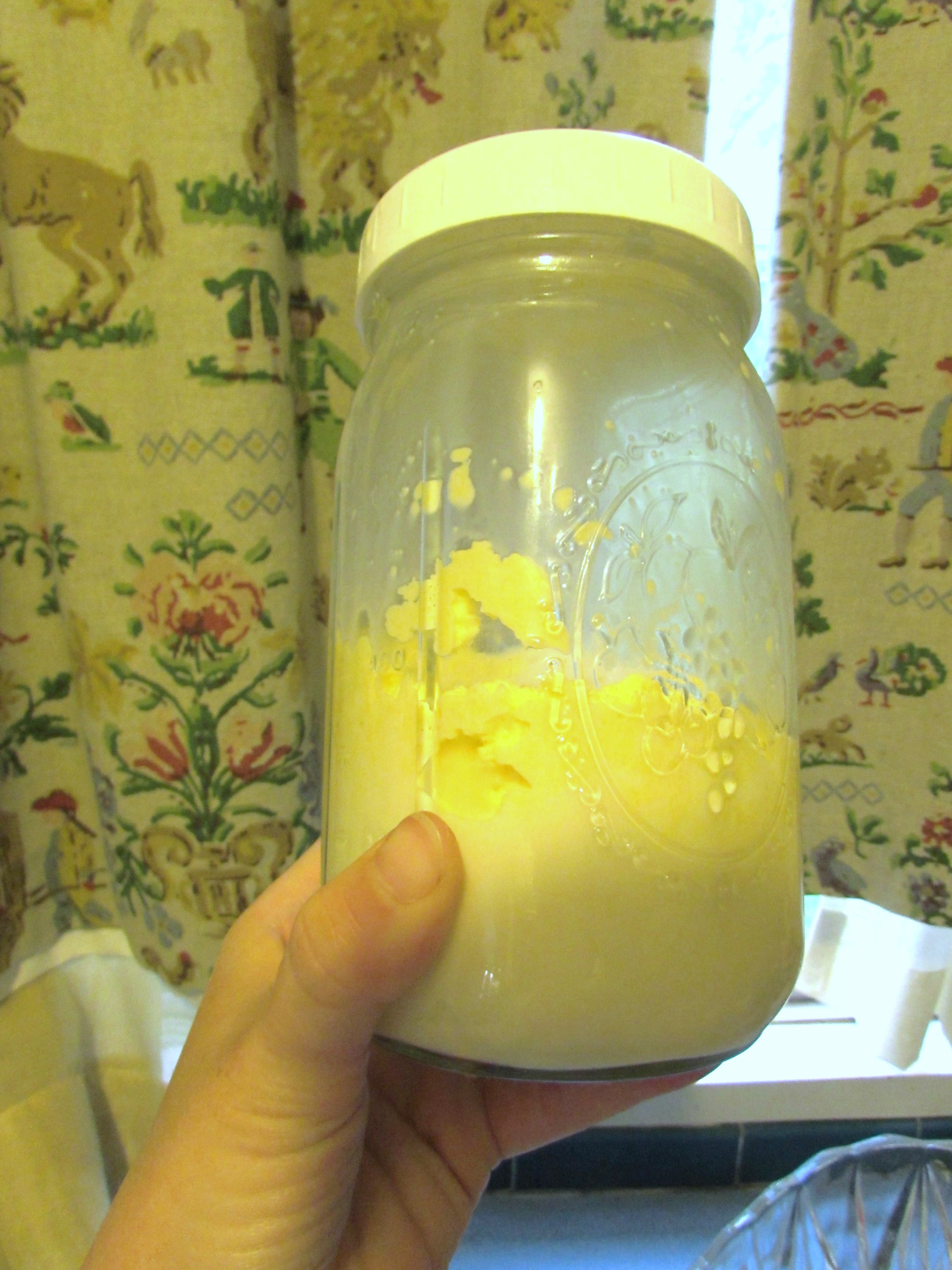 So, just keep shaking and in just a few minutes you will notice it feels a little different, keep going and suddenly you feel something quite solid bumping the sides of your jar. Swirl it around and you should see lovely bright yellow butter bits floating around. Well, they may or may not be bright yellow. This depends on the cows diet, in the winter when there is no green grass the butter will be very pale but when spring rolls around, ta da! Bright yellow butter!