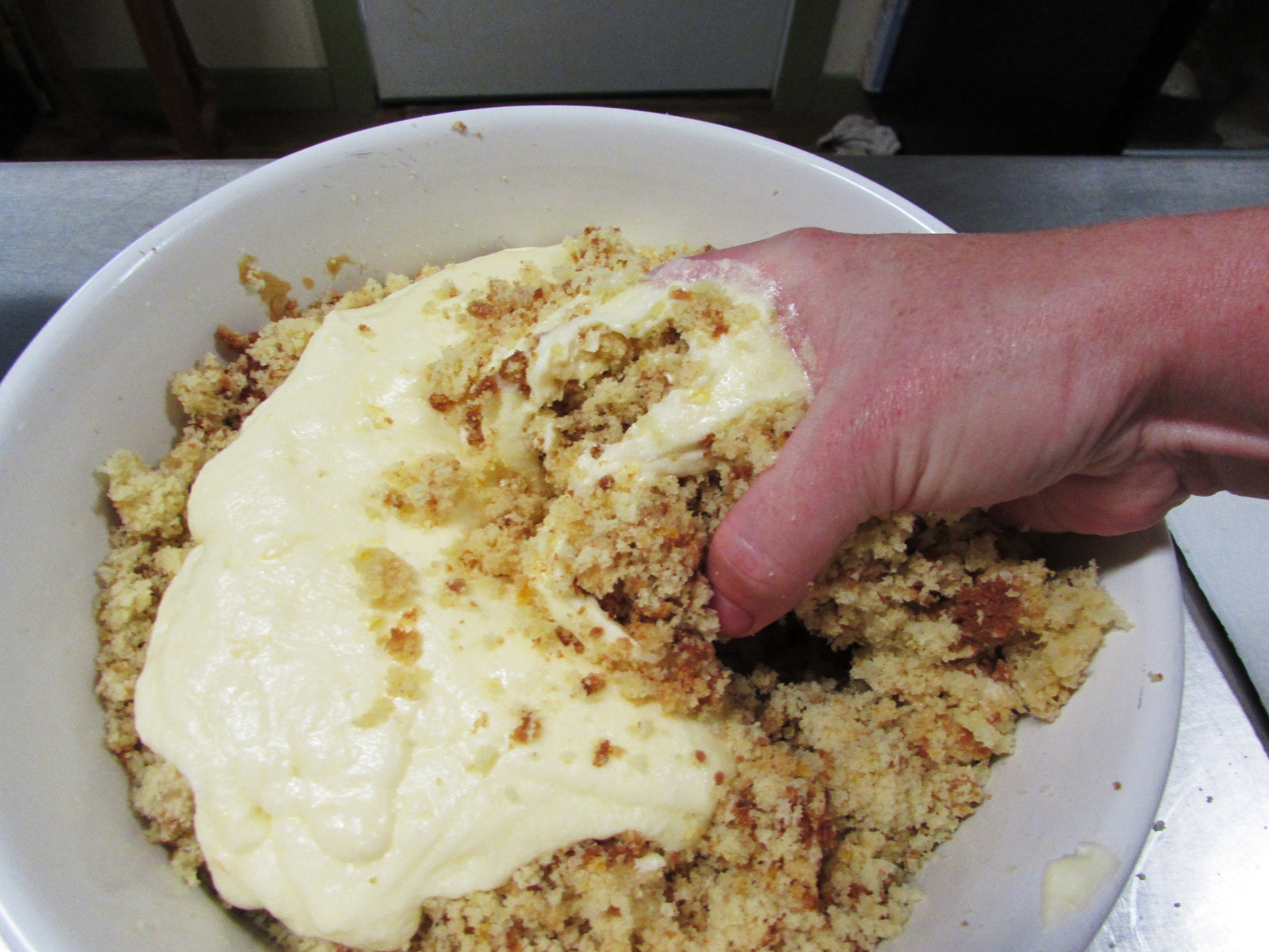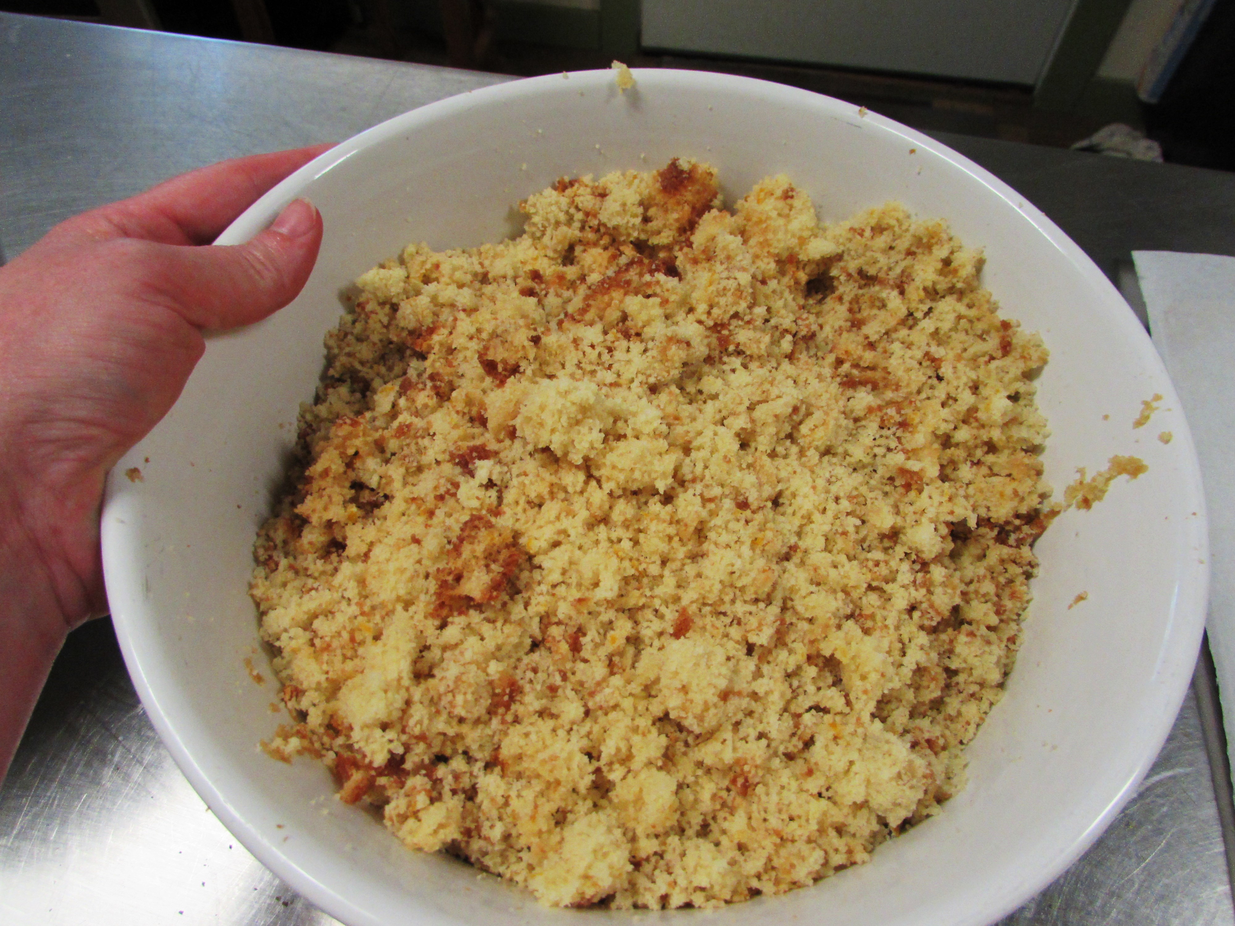 When the cake is completely cooled tap it out into a large bowl and begin assaulting it. You want to make it into little bitty crumbs.