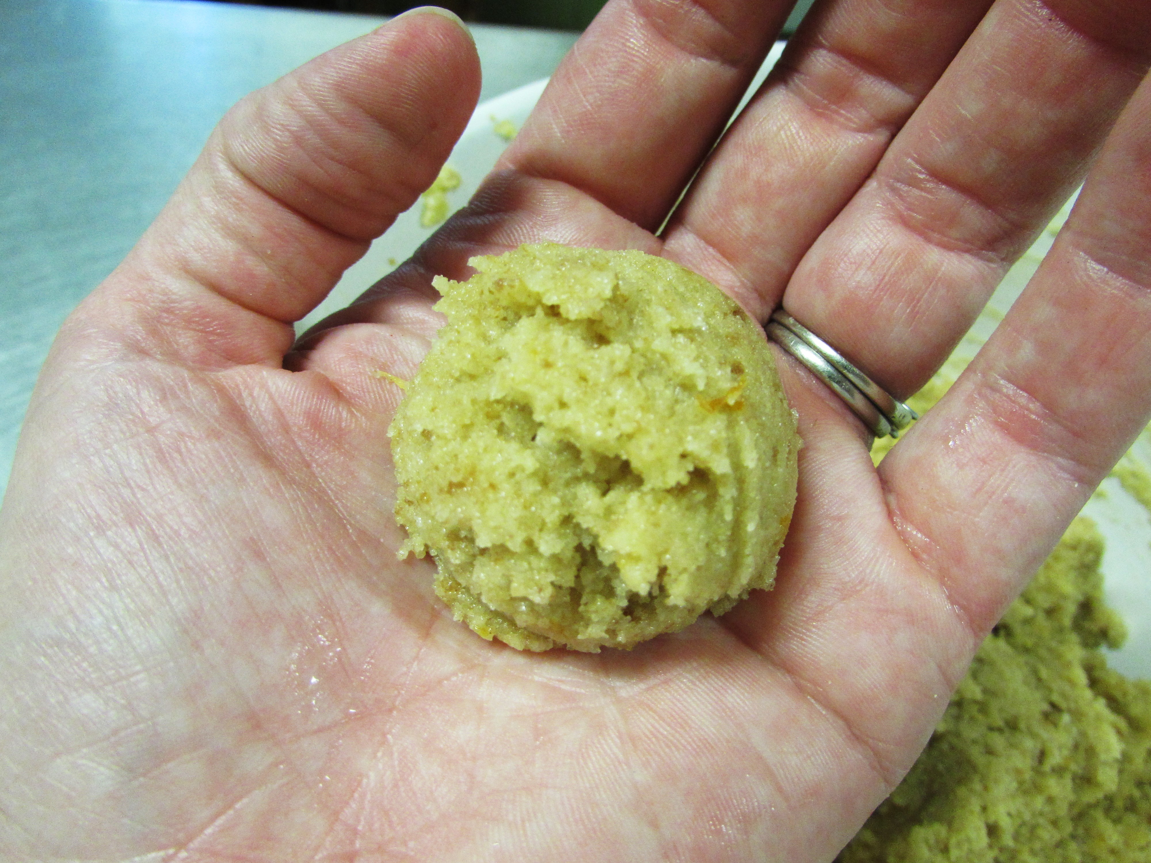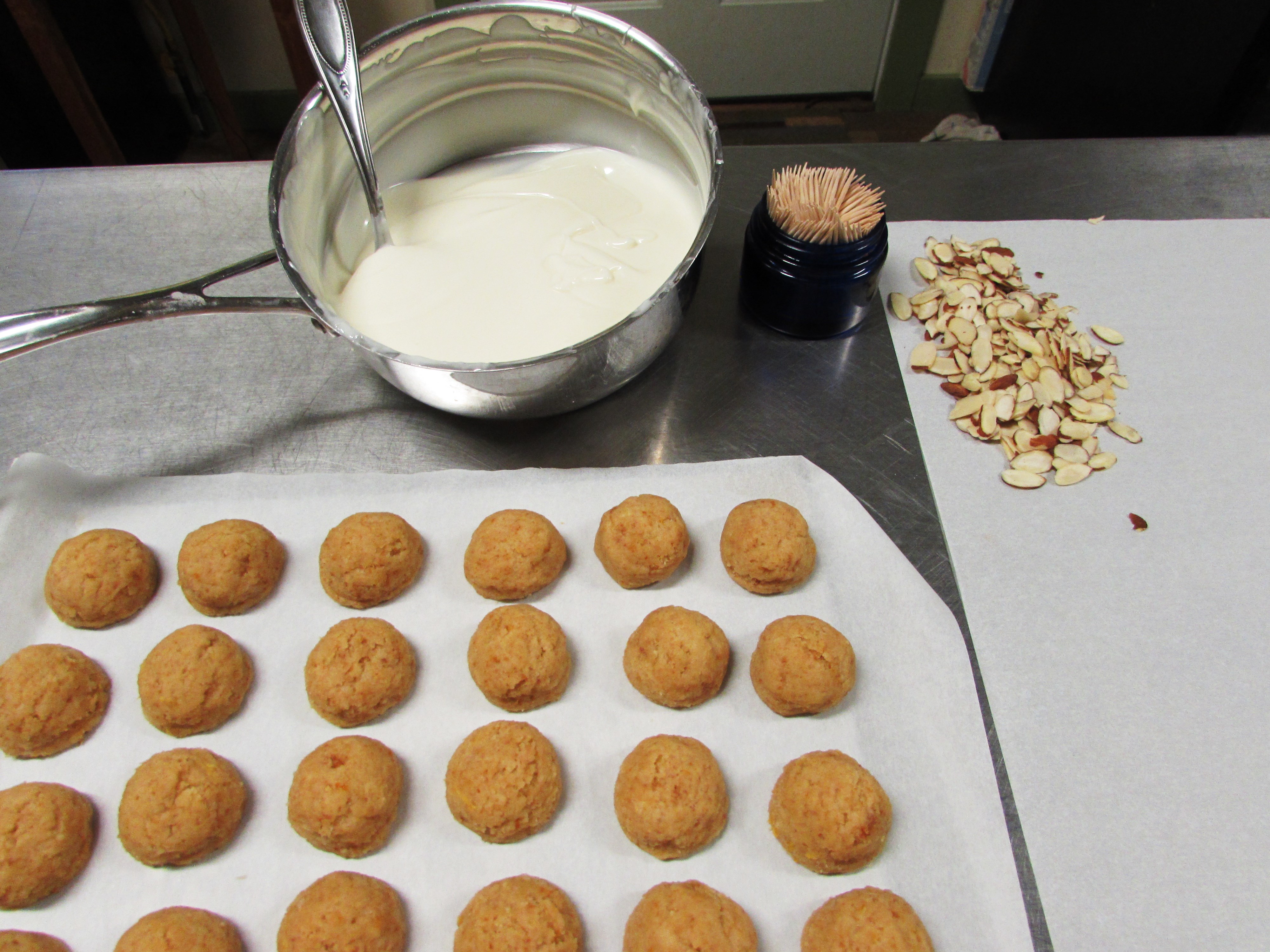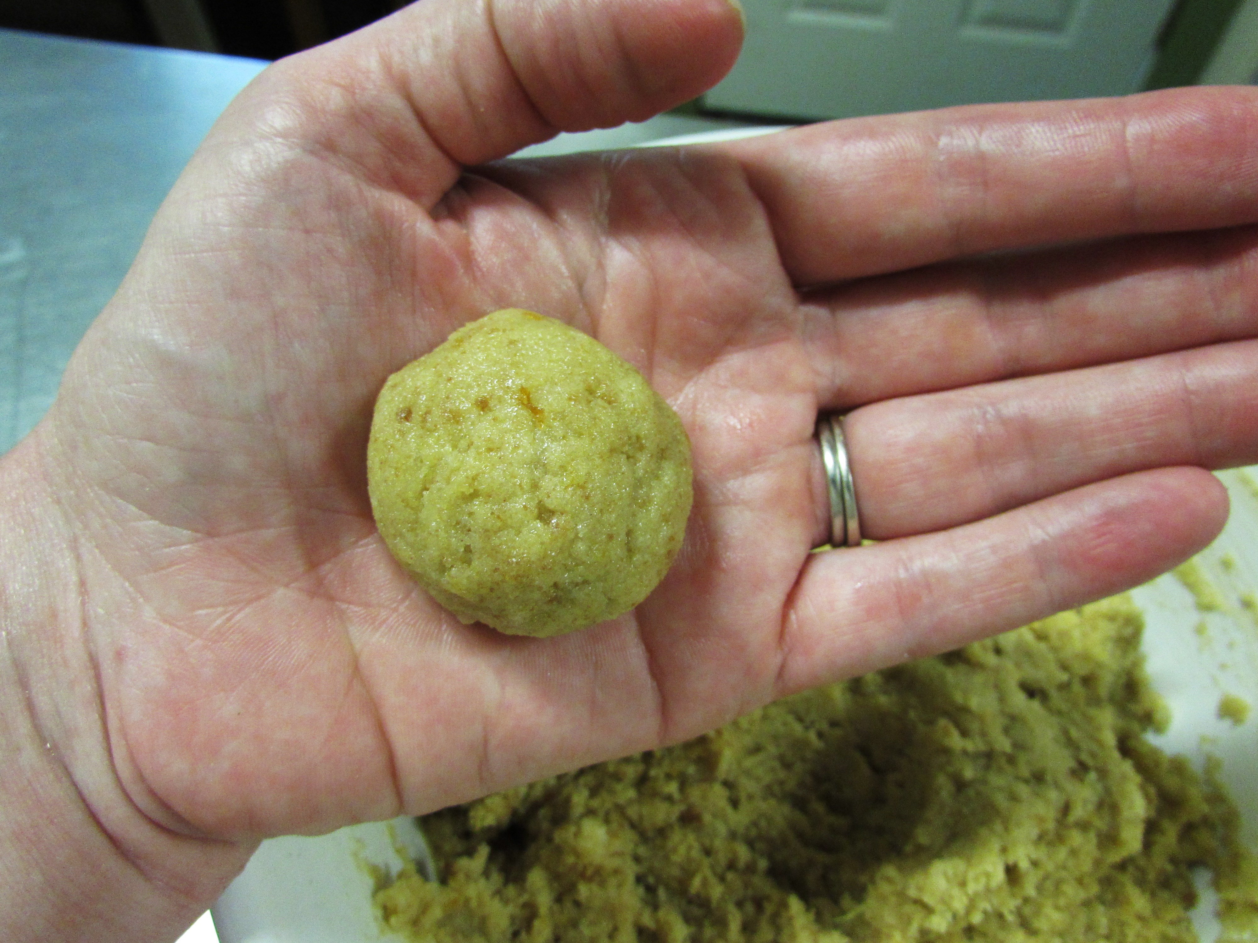 Soft balls fall apart in the almond bark, not cool. See above back story.