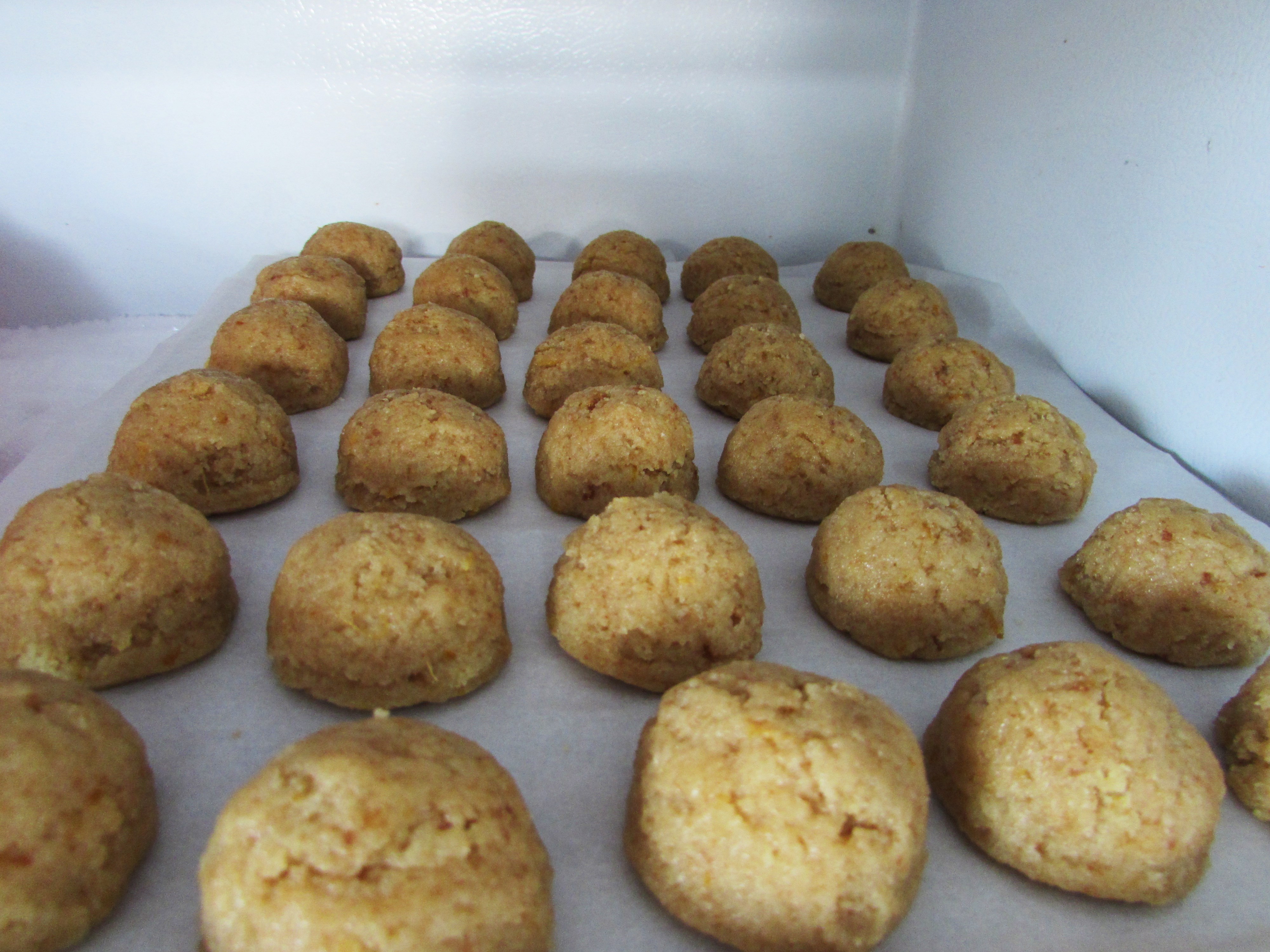 Place each ball as it is made on a parchment lined cookie sheet. When the sheet is full place it in the freezer for about 30 minutes. You want them to be like little cake rocks. However DO NOT leave them to long, they will begin to gather little frosty crystals on them which makes them sweat later. Sweaty balls are never a good thing.