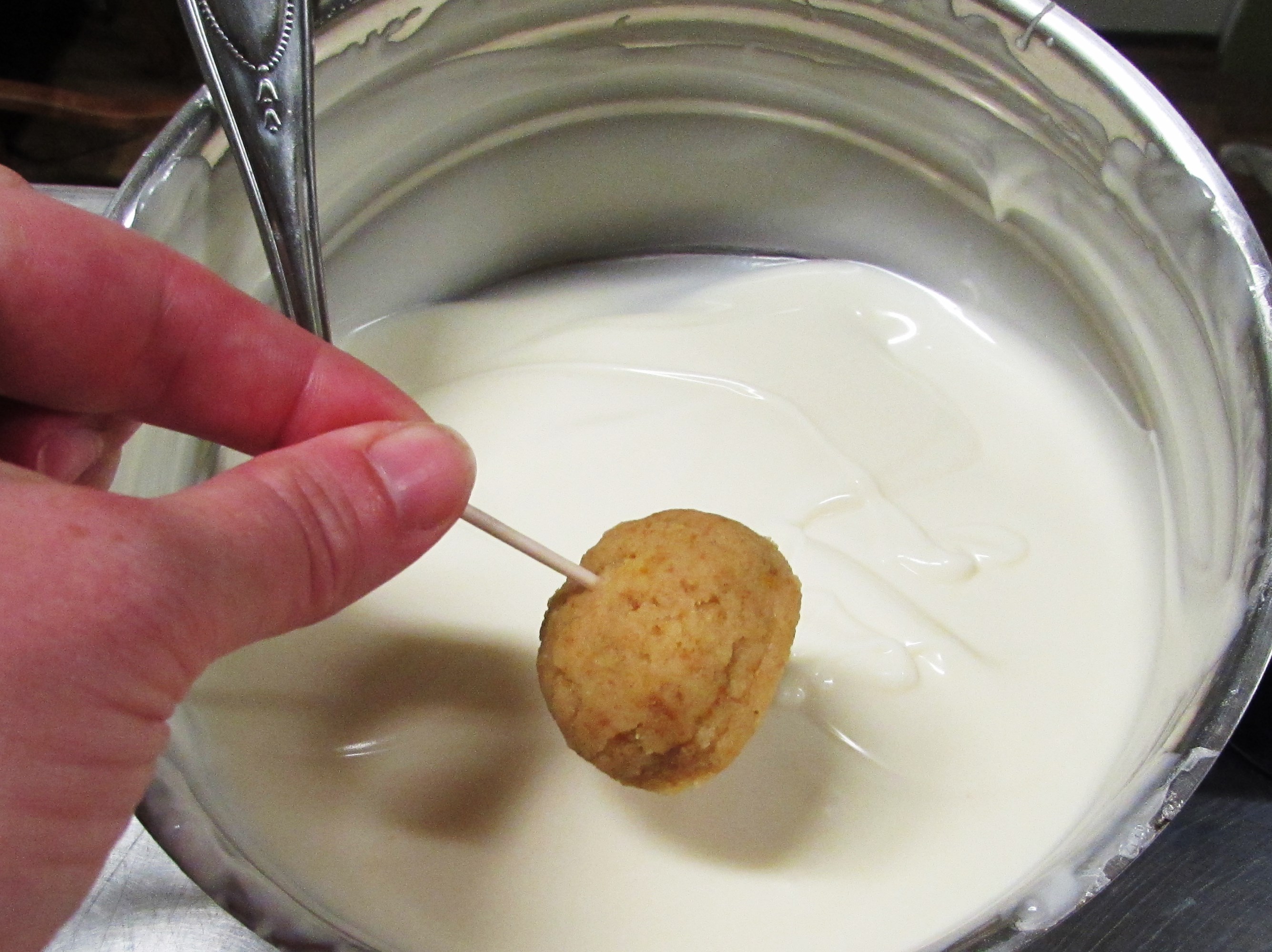 Carefully insert a toothpick about 3/4 of the way into the cake ball…..