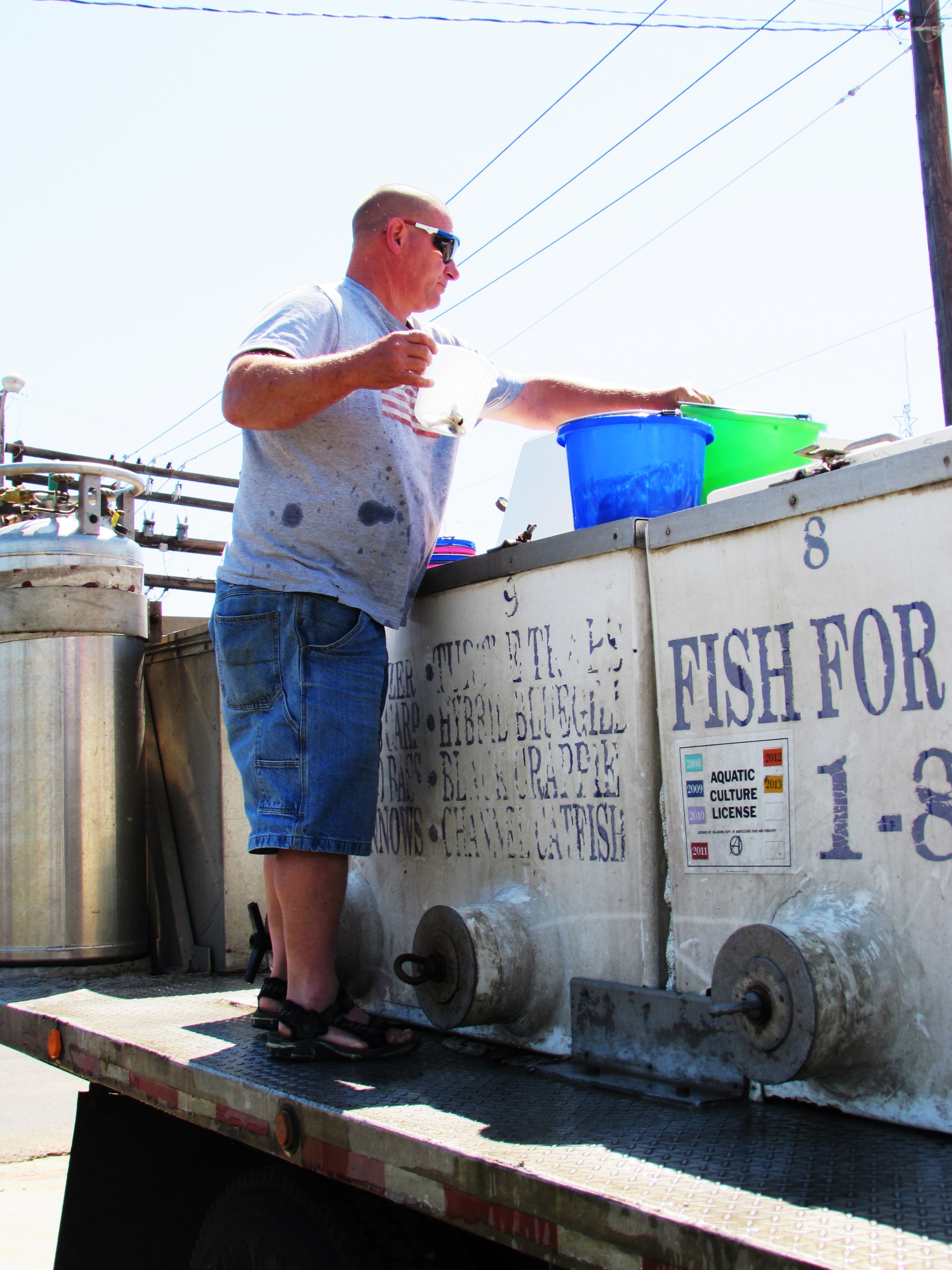 The fish truck arrives with 2 men, several dozen buckets and thousands of fishes in special holding tanks.