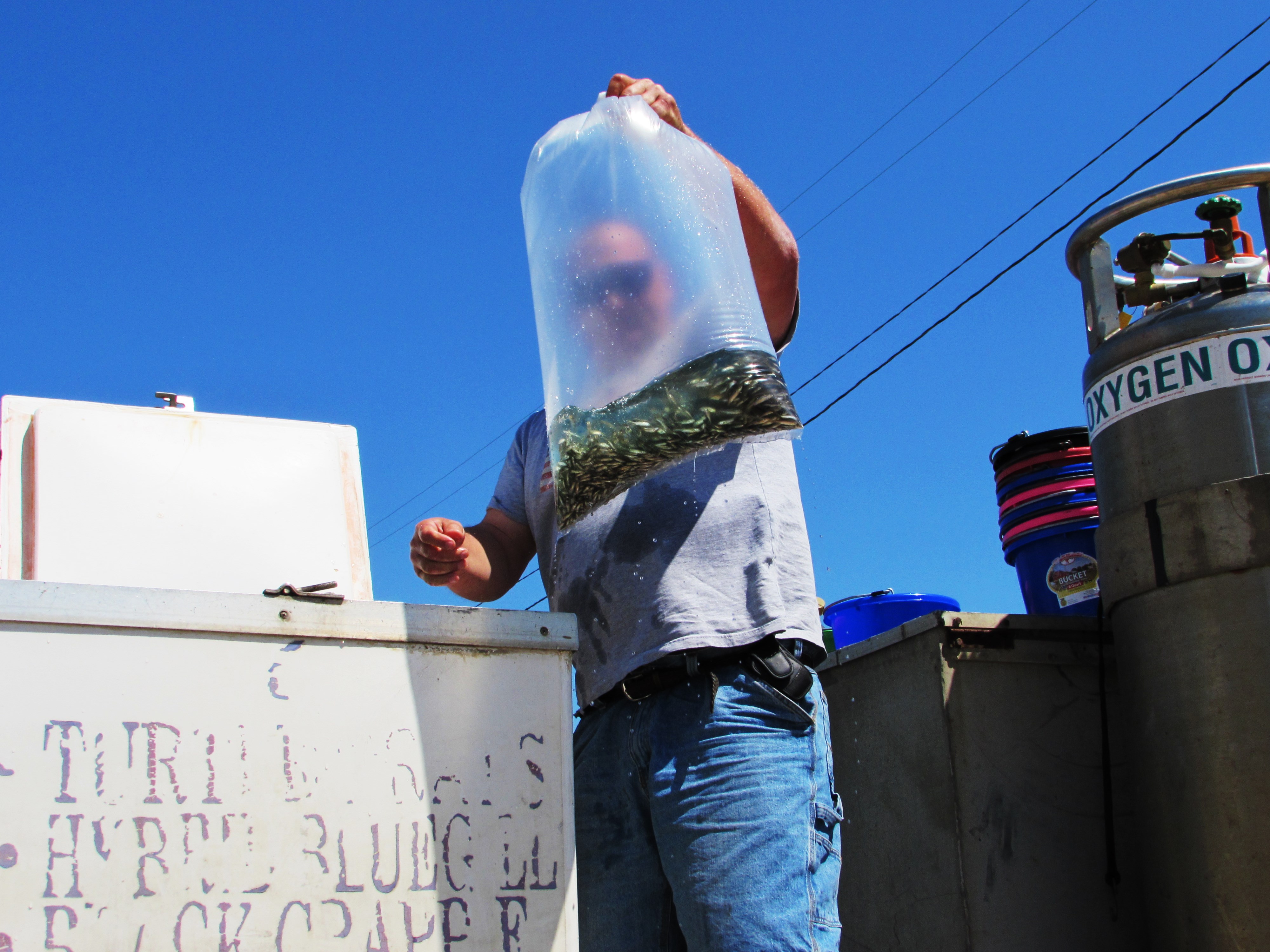 They (the fish) are placed carefully in a clear plastic bag that the men blow oxygen into from a large tank so the fish make it to their new home without suffocating.