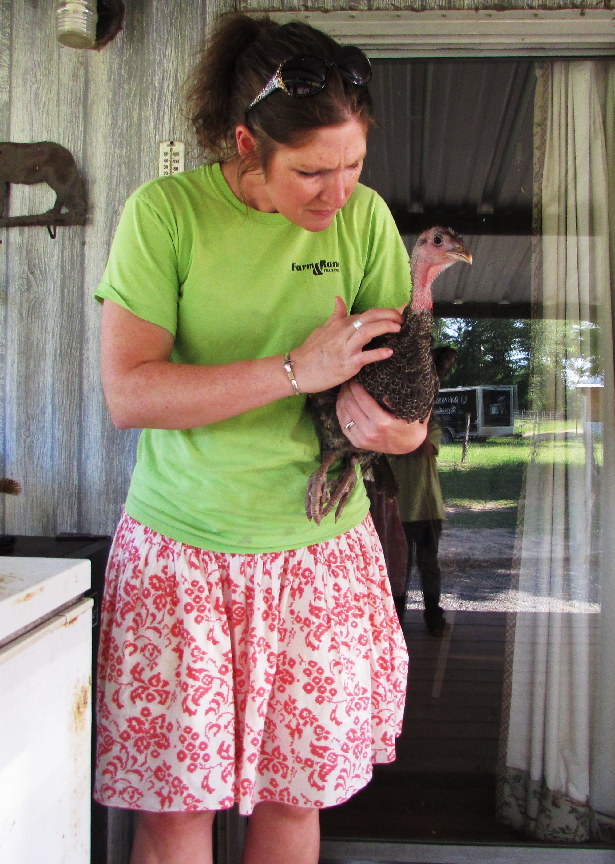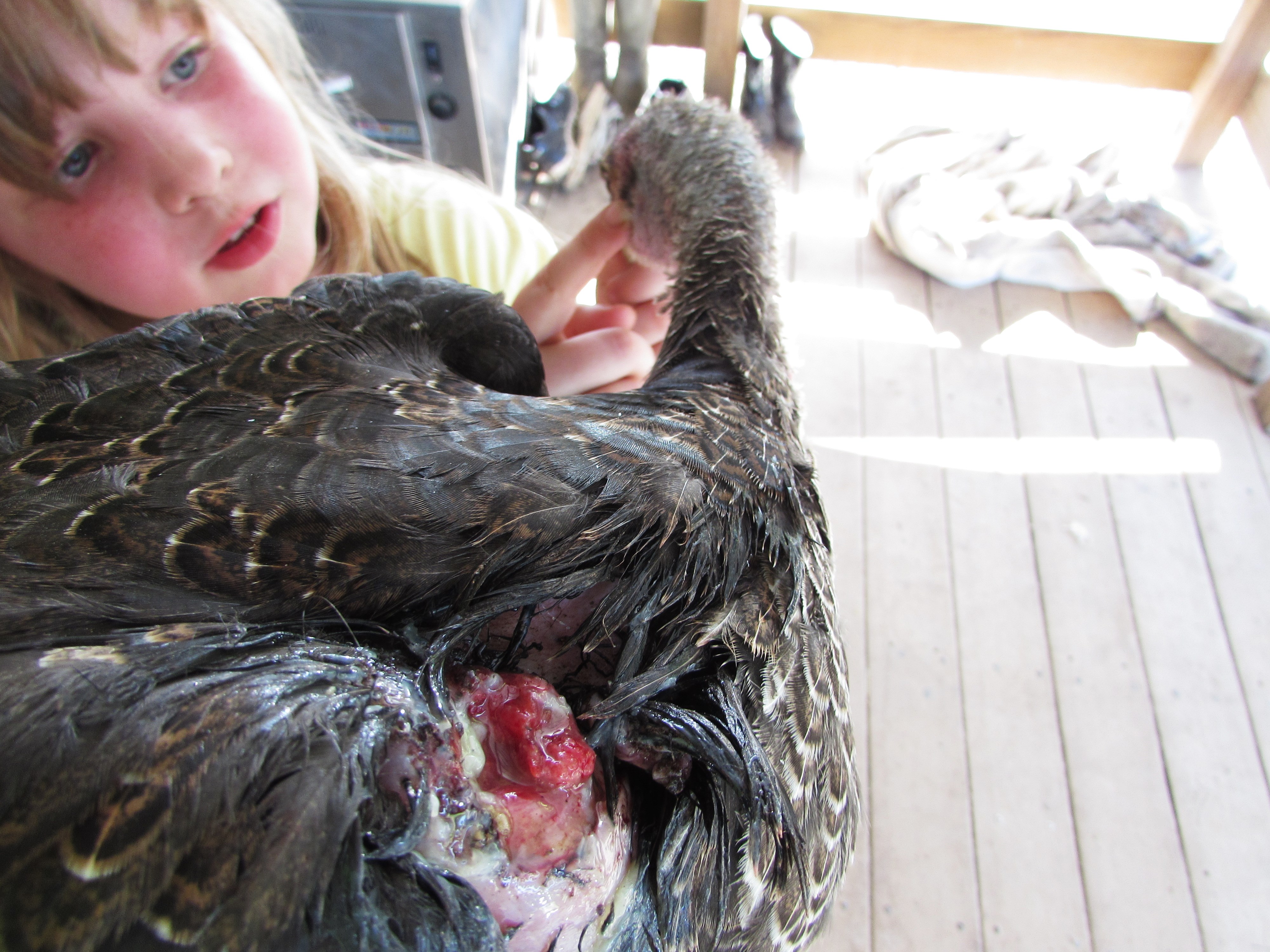 Addie was the first to spot his wound and I’m sure it was pretty comically watching me attempt to catch him. Young turkeys are really strong by the way. This is the second wounded fowl I’ve had this year. The other was a chick who survived a coon invasion 2 months ago. After a week of living in the laundry room and receiving top-notch medical care she made an excellent recovery although she will never to able to fly very well. I am sure a coon is to blame for this tragedy as well. Country living is tough sometimes.