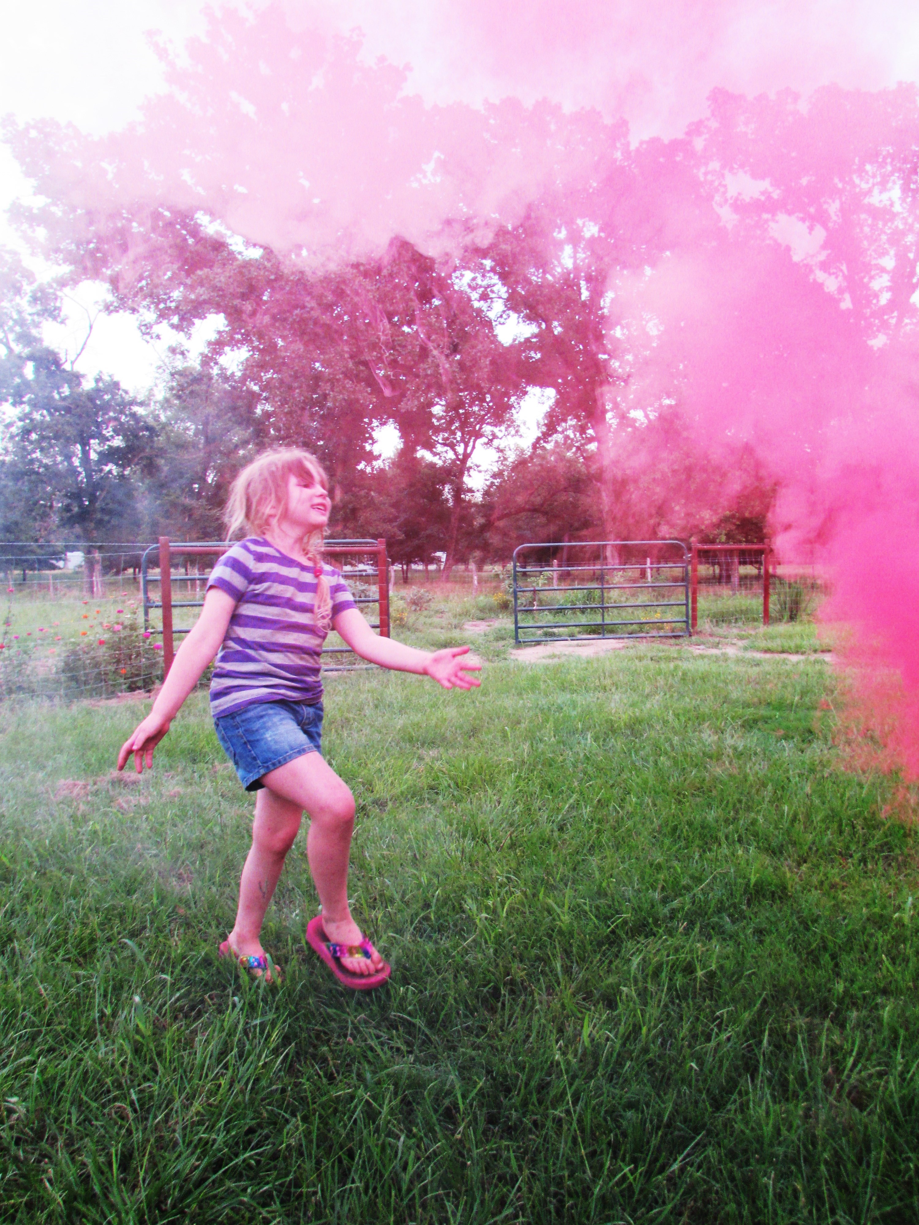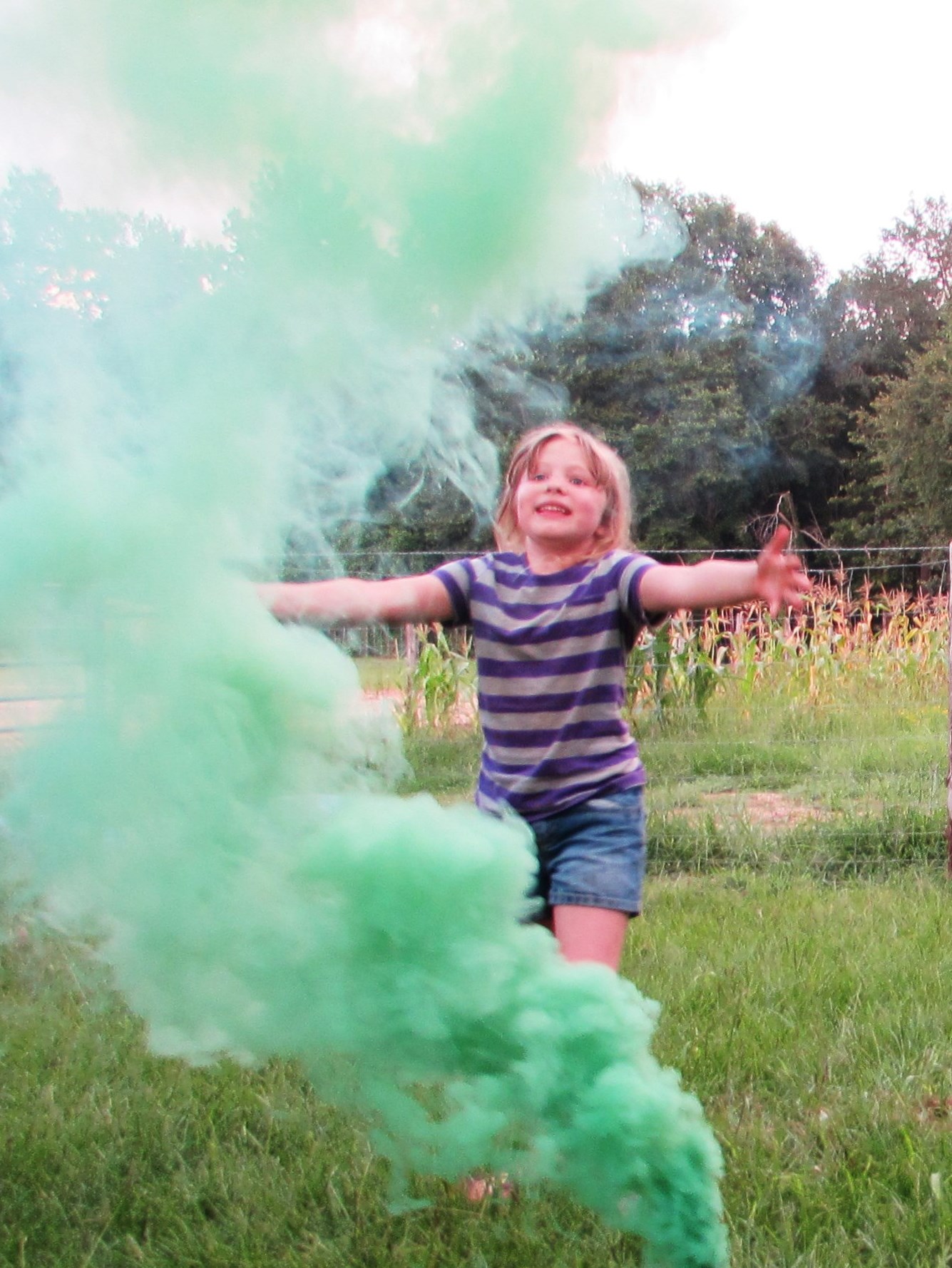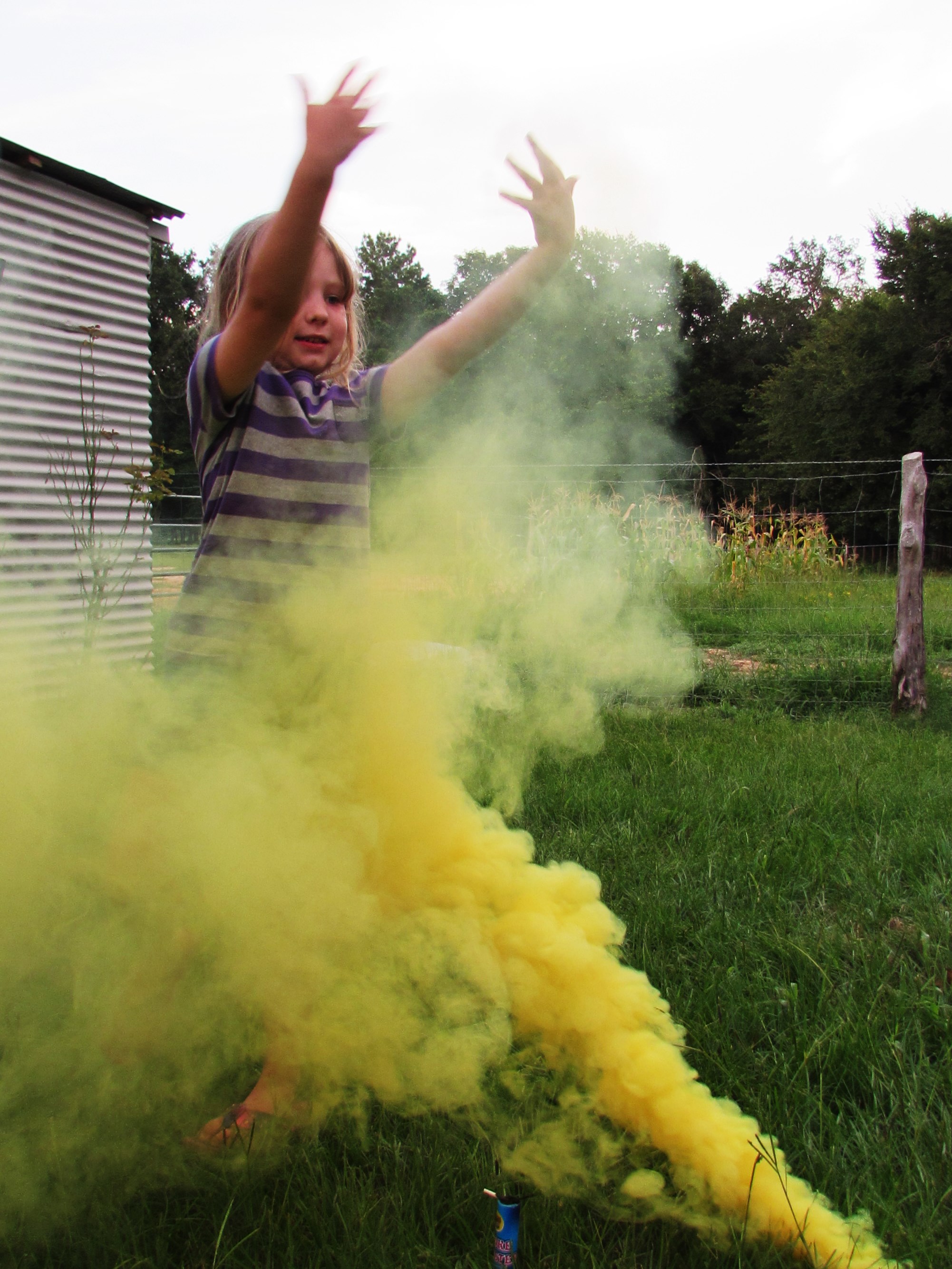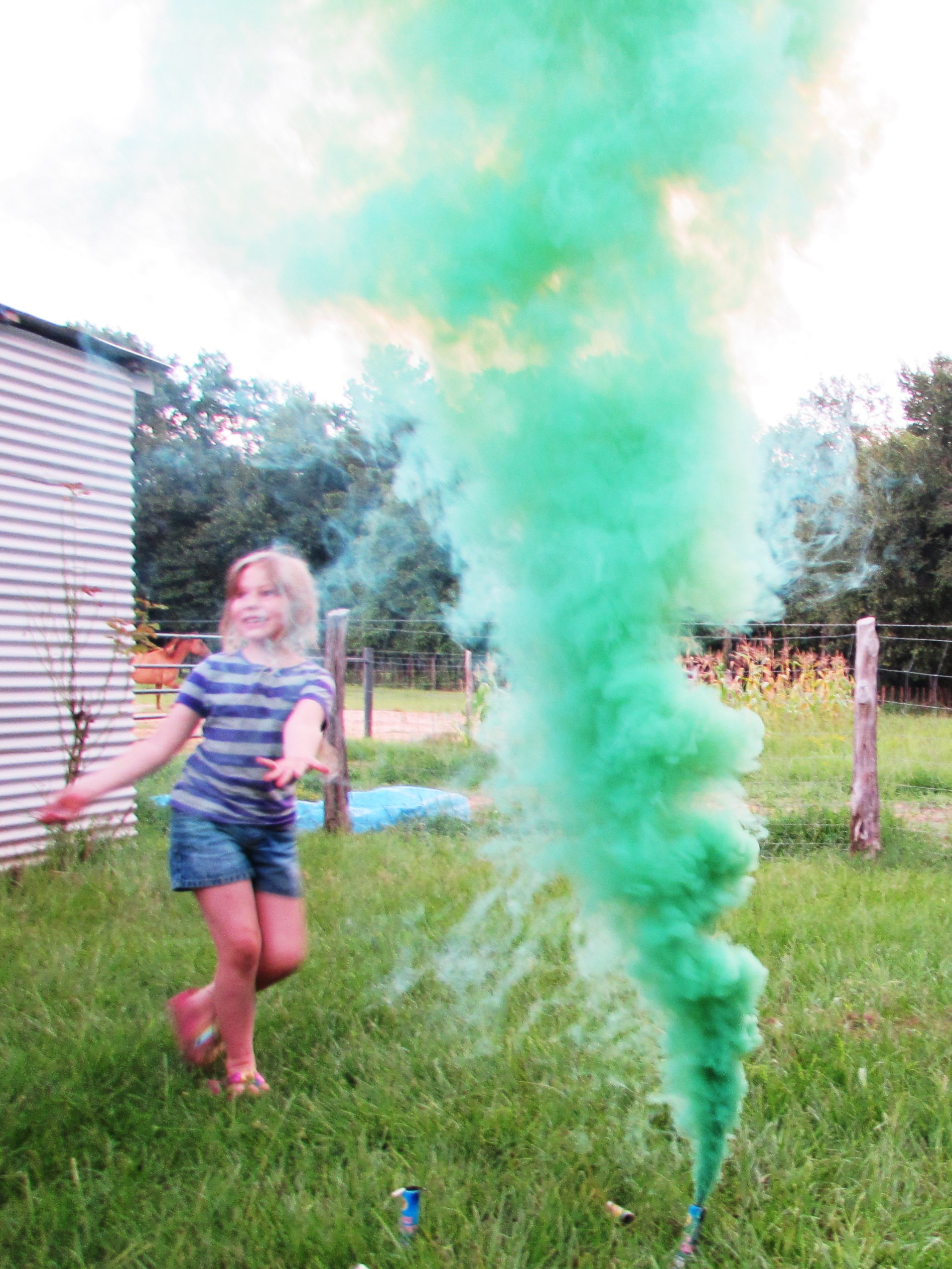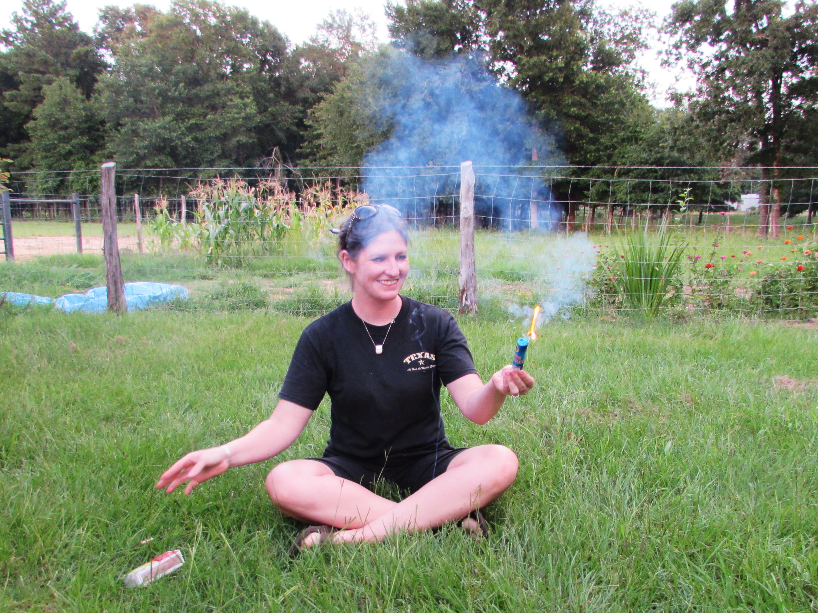 Our 4th of July was simple and fairly noise free.  We drove 2 hours to Louisiana, my husband shod 2 horses, Addie enjoyed the swing and I took turns watching them both.  Then we drove 2 hours home, grilled some ribs and veggies from the garden and did fireworks.  The smoke bombs were first.  I love smoke bombs.