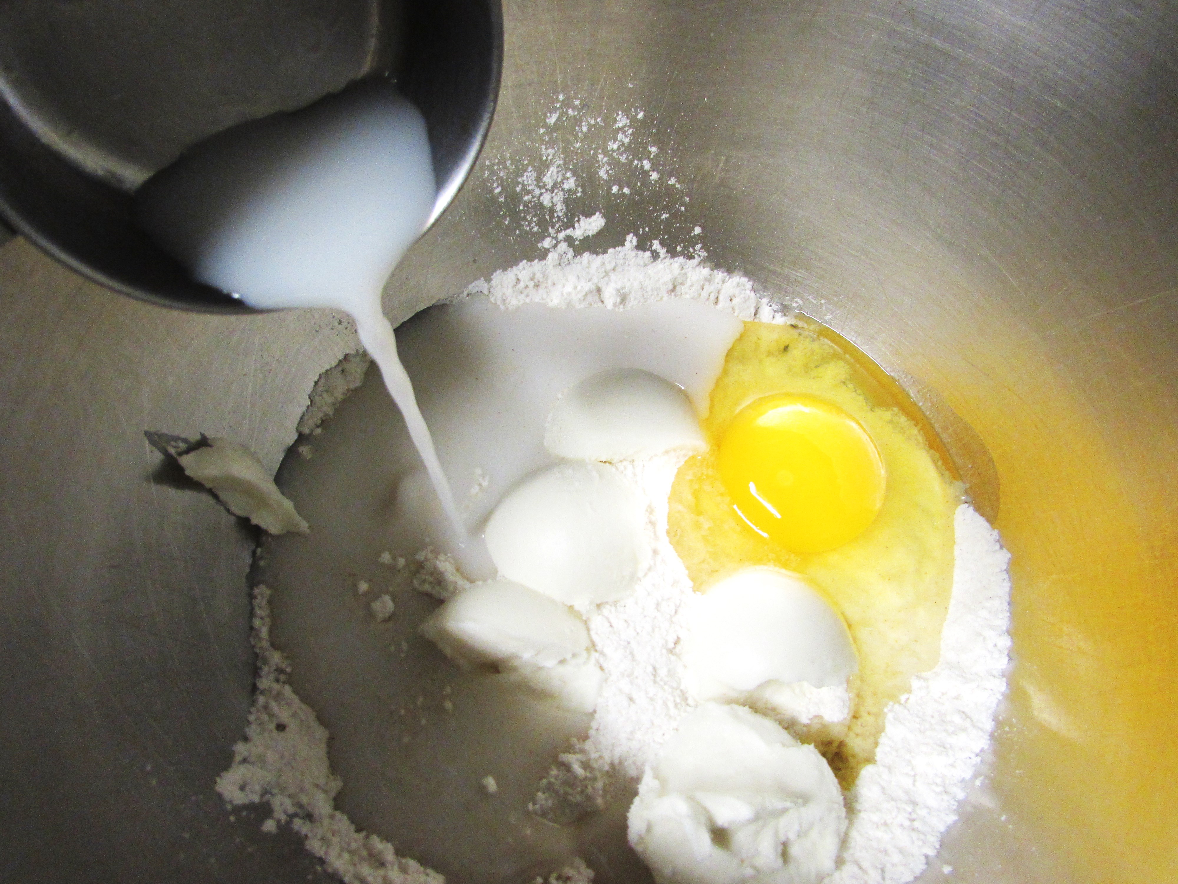 You begin with the ingredients seen above. Gluten free cake mix (Red Mill is good but any of them will work), rice milk, non-hydronated veggie shortening, vanilla & lemon extract, powdered sugar and an egg.