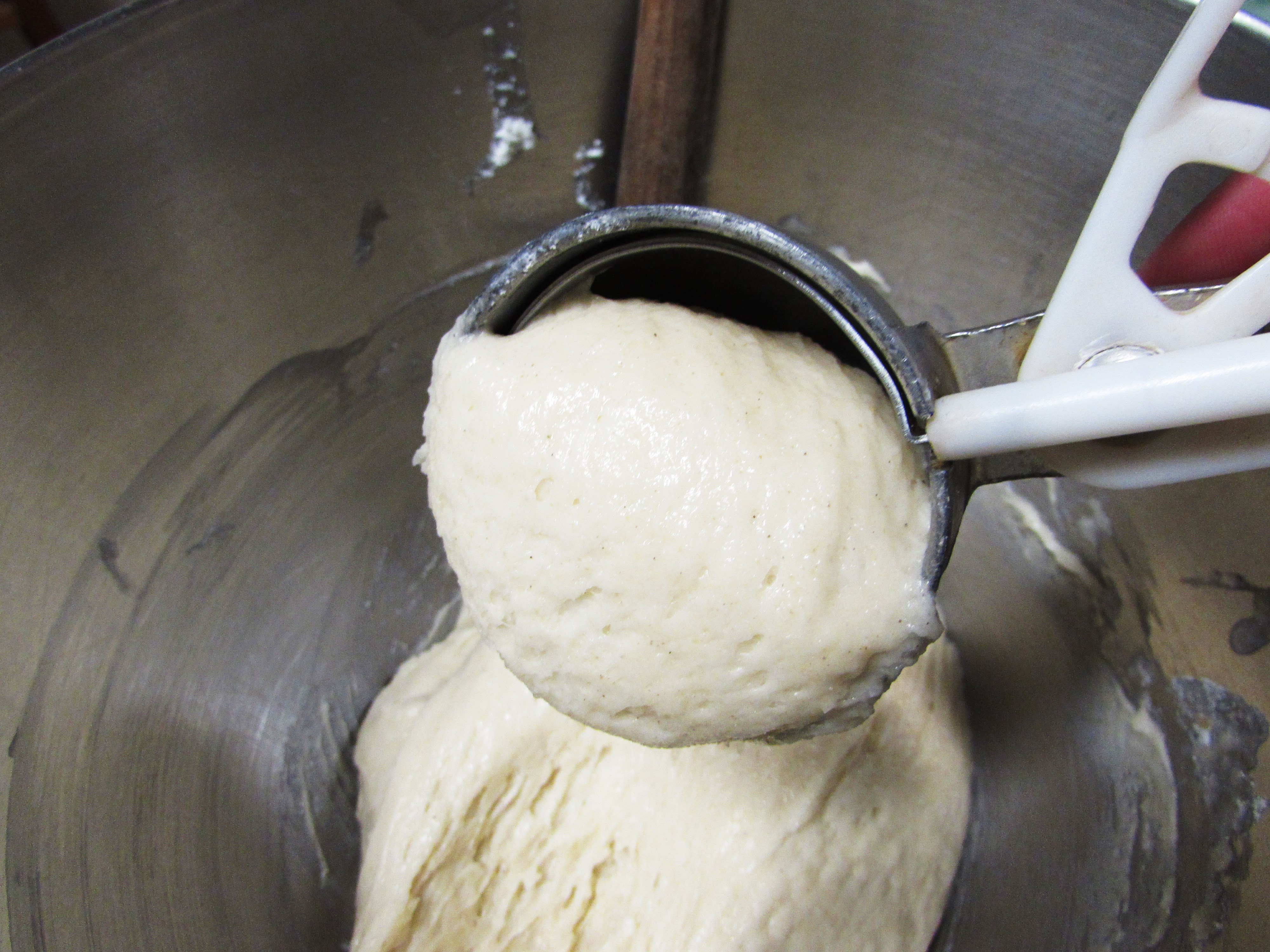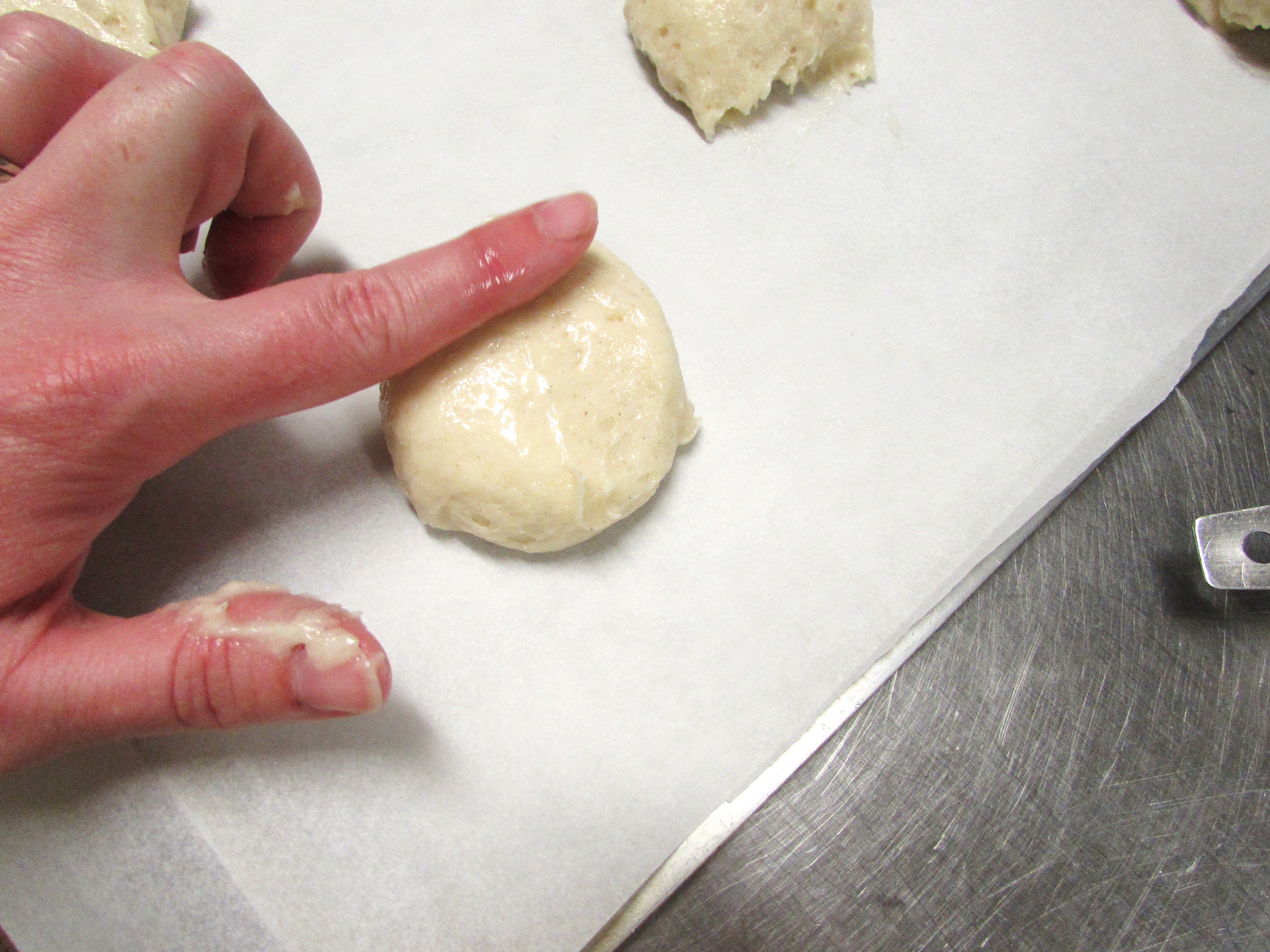 Grab an ice cream scoop, just make sure it is the kind with a trigger so you can shoot the batter out. Otherwise you will have a mess. I only fill the scoop 3/4 full then plop them out onto a parchment lined cookie sheet. These are the only cookies I use parchment for but it is a must!