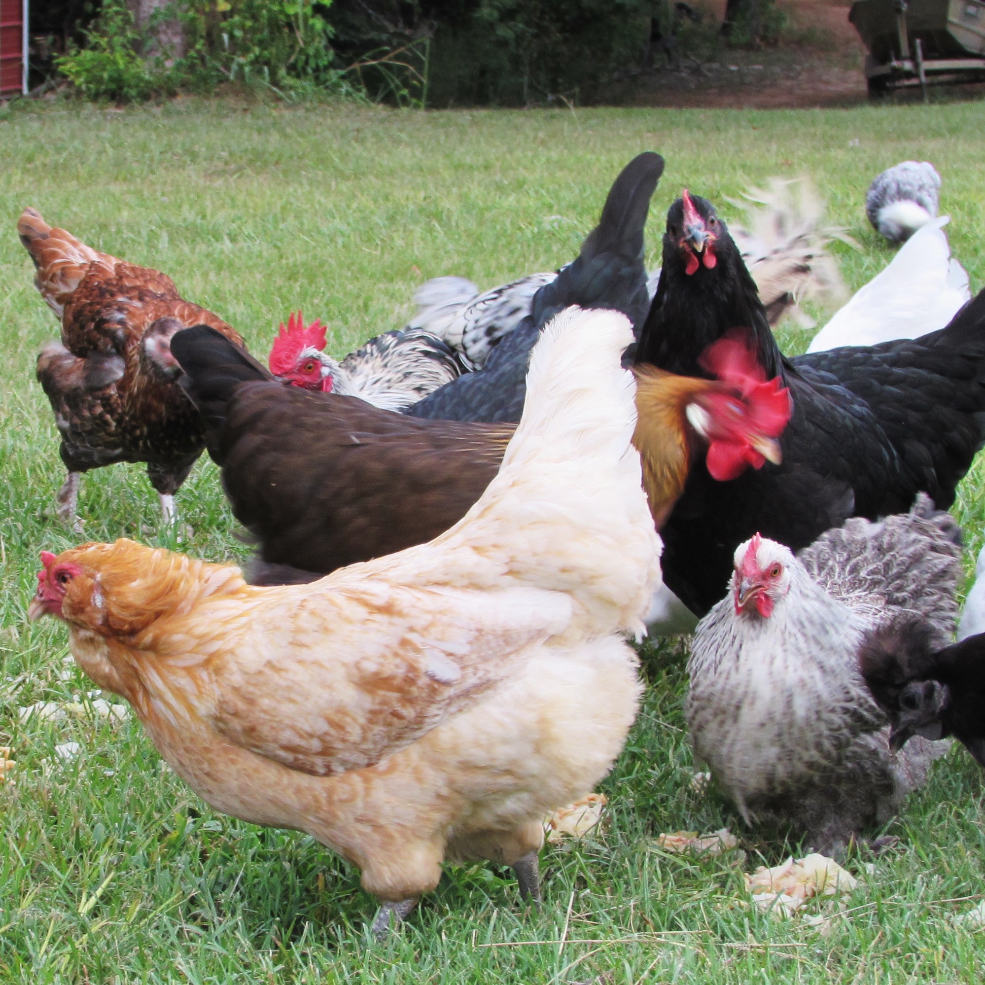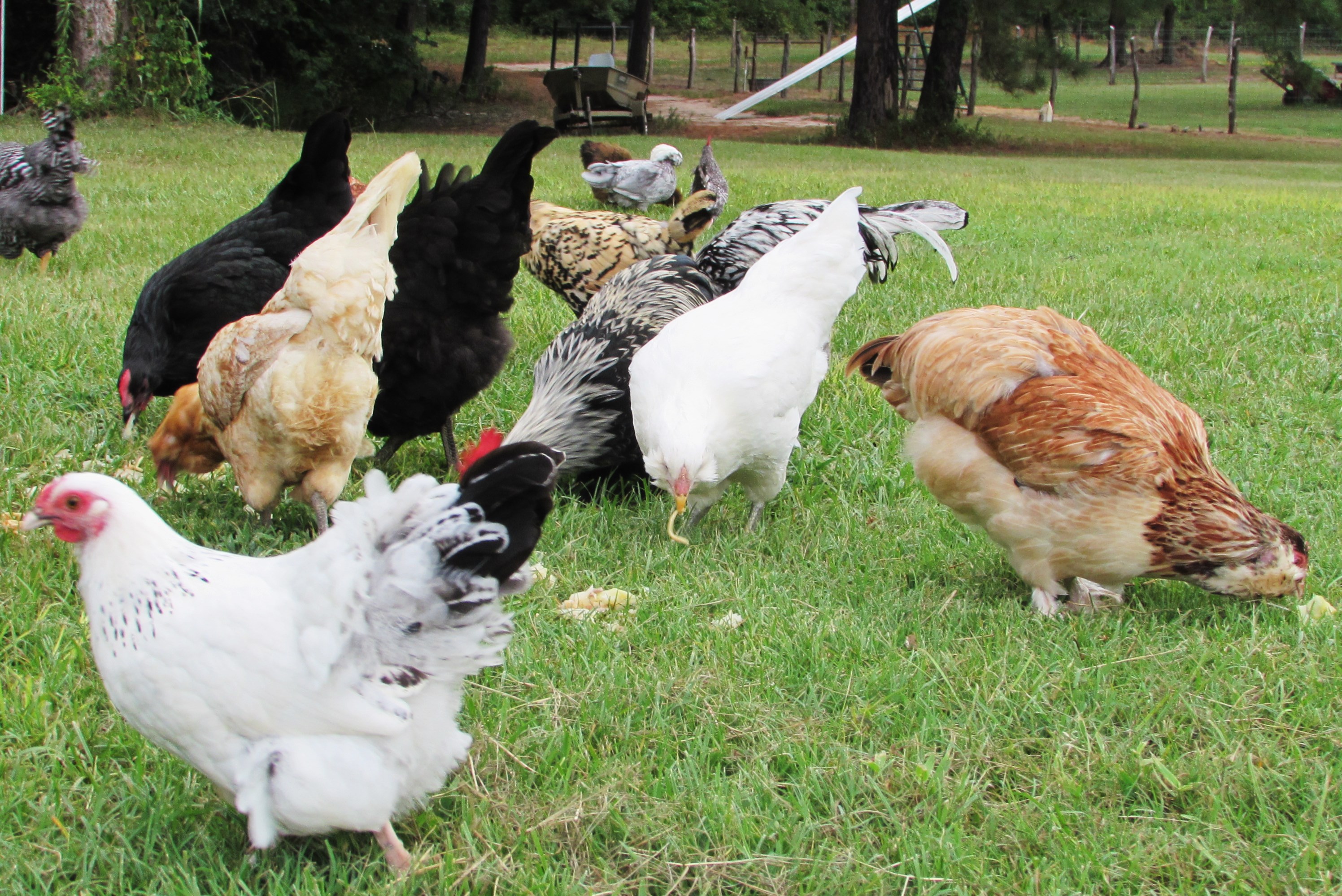 Anyway, back to the birds. So last Wednesday was the monthly nursing home luncheon. This is the day all the area nursing homes load vans and buses with their residents and haul them to the fellowship hall for a couple of hours of visiting, singing and of course, a covered dish lunch. I try to never miss one of these, I adore old people. I adore the fact that Addie gets to help serve dessert and give them their drinks. I love to sing, even if it is really off-key, I figure three-fourths of the crowd is pretty much deaf so it doesn’t matter. And I love the food. I love seeing long, white, folding tables laden with chicken spaghetti, egg-rolls, pea salad, brisket, homemade bread, deviled eggs, pickled beets, mac and cheese, pasta salad, purple-hull peas with bacon, broccoli cheese, steamed cauliflower (which is my favorite said nobody ever), cornbread, fresh green beans, chocolate cake, carrot cake, strawberry pie, angel food cake, sugar cookies and trifles! We Baptists KNOW how to eat! Which is why I thought my flock were perfect candidates for conversion. Food is their favorite thing! After the luncheon there is always a considerable amount of leftovers and I fix my darlings a to-go dish each time. They love me for this reason and probably this reason alone. Immediately seeing the large aluminum baking pan, they rush to meet me halfway across the yard……….