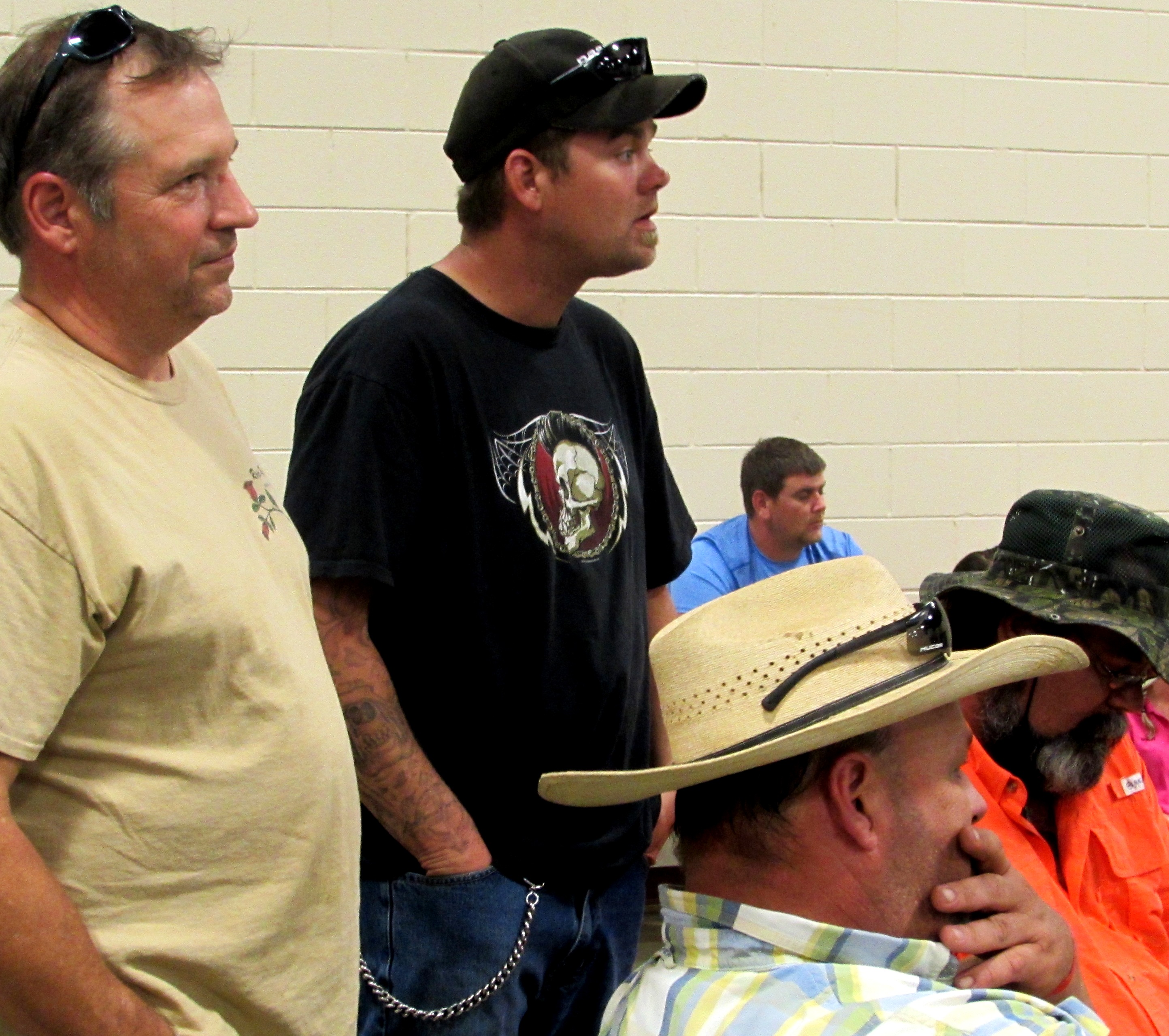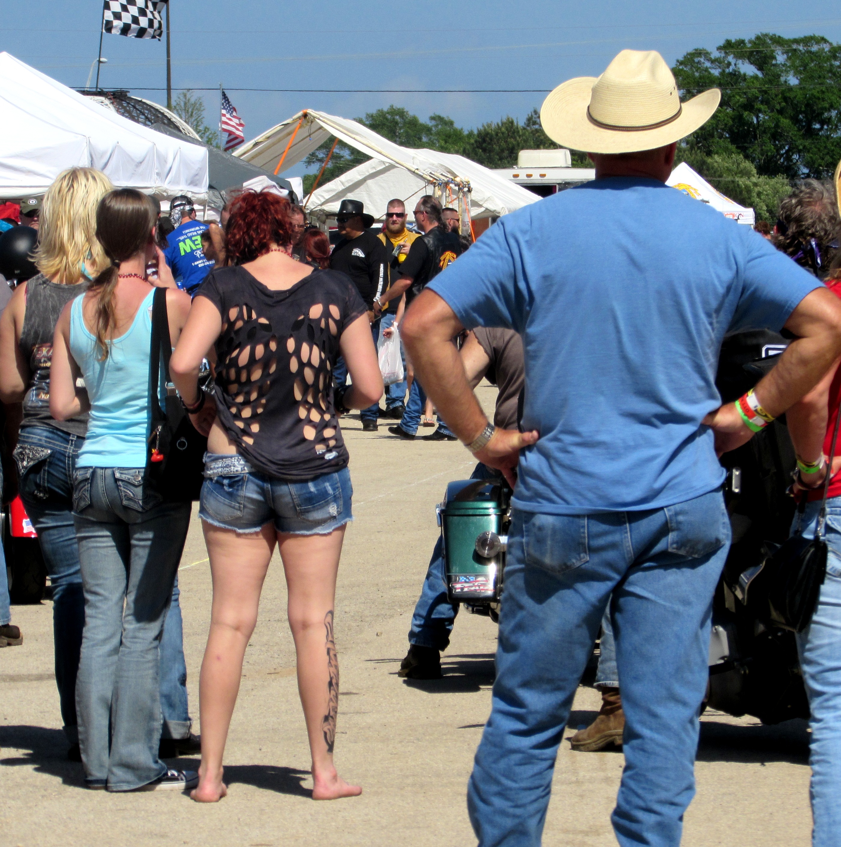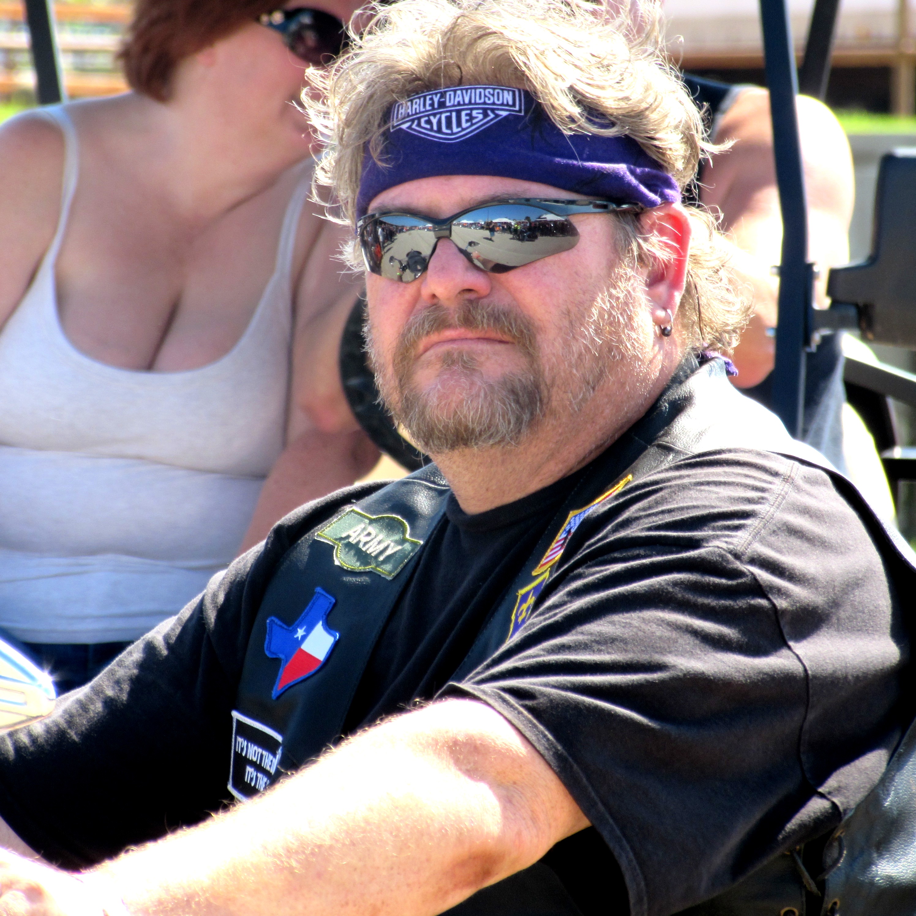 I wasn’t exactly sure what to wear to a biker rally and since my black pleather pants have been gone since 1998 I opted for a khaki skirt, flip-flops and a cheery blue t-shirt. I’d like to show you the only other 3 people wearing blue at the rally.