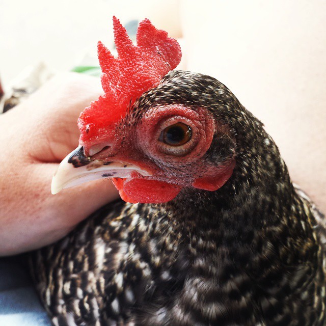 This was the chicken, who from the day I brought her home, loved people. The first time she flew on my shoulder I almost had a heart attack. She flew on my husbands head a short while later. I kept thinking she would grow out of her friendliness but no. She was a lover of people through and through.  She would come in the house, the barn, the car.  Oftentimes as I scratched her head, right behind her comb, she would fall asleep there in my lap.  She would run to me as soon as I got home each evening, her little feet beating madly against the ground until she reached me.  I guess it is a little silly to fall in love with a chicken.  But I am a little silly I suppose.