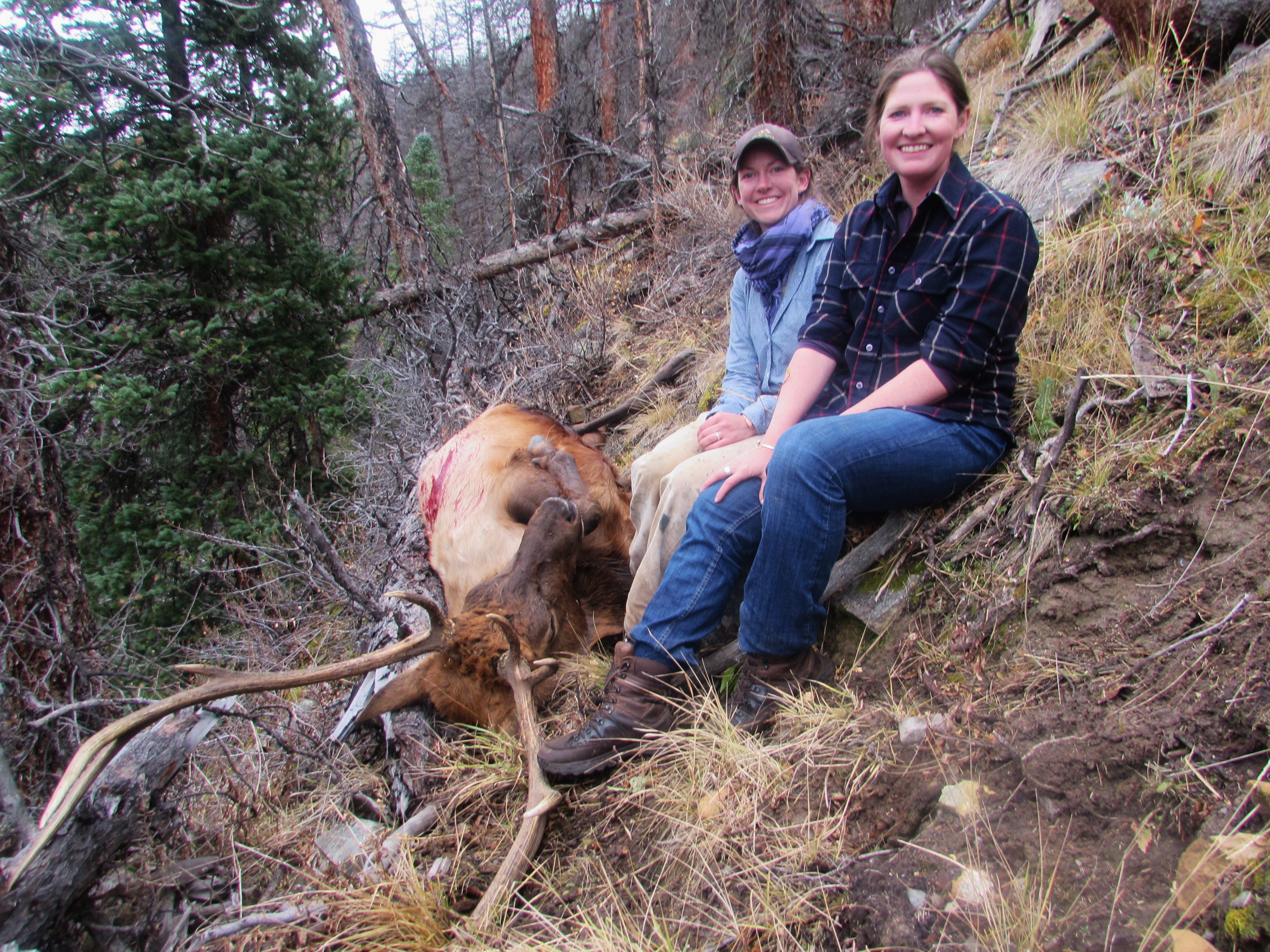 “Rita” I whisper.  “Rita” a bit louder.  “Rita, ELK” I rasp out.  She is looking thru her scope at the mountaintops, contemplating which snack she wants.  “Rita, ELK” I screech thru my teeth at her, at this point frantically snatching off my bino’s and camera so I can lie down for my shot.  This gets her attention and she sees the herd below, crossing the creek just underneath us.  5 or 6 cows out front and a good-size bull pushing them.  I plop, belly down, on the hillside.  I try to get my gun to my shoulder.  I can’t.  I strain, wiggle, grunt and shove but my coveralls, just a tad to small while riding, are like a straight-jacket when trying to stretch into a shooting position.  What should have been a half-dollar sized sight thru my scope, grew no larger than a dime.  I simply could stretch far enough.  The elk are beginning to climb the steep ridge opposite us.  I get the bull in my dime sized scope, hold, squeeze, BOOM.  He doesn’t move.  I jack another round in my gun, and BOOM.  Rita got a perfect shot, thru the lungs and he never went another step.  As I watched him drop then roll half way down the ravine I knew my sister had gotten her first elk.  It was awesome.
