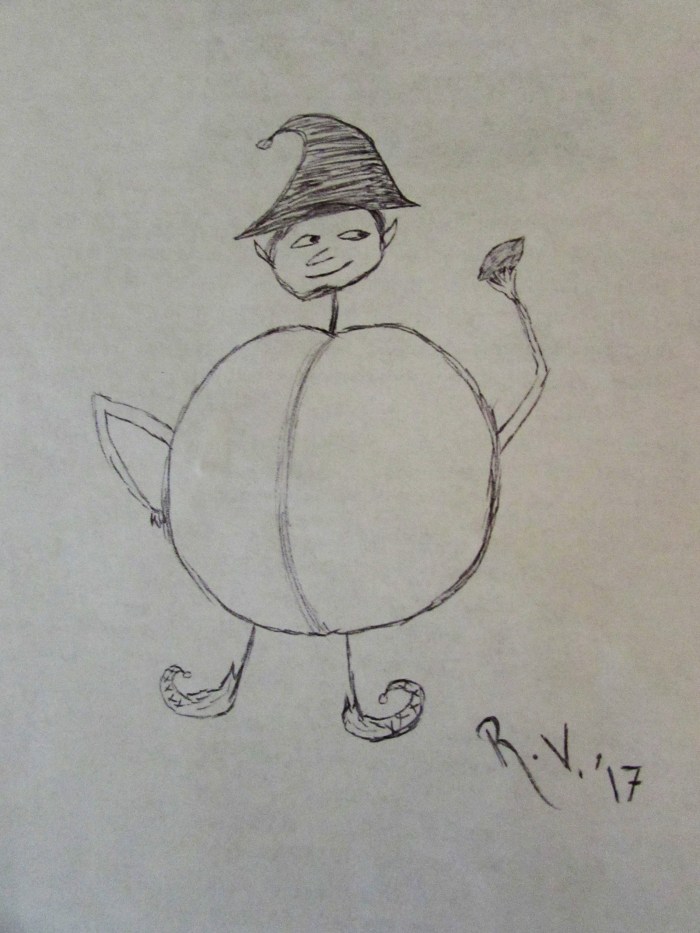 I also am fond of persimmons. And I knew the trees must have lots of ripe fruit available. Ever wonder how persimmon seeds get spread? I was contemplating this, among other things, as I strolled along the black top. I thought, “How lovely would it be if there were little persimmon people who flitted about the fields, planting little persimmon seeds from which new trees and little persimmon people babies would sprout?!” Then I drew a persimmon person in church (Sorry, Preacher!)