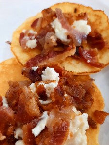 Thankfully I had some almond flour in my freezer, something I promise you I won’t run out of again. Ever. That, along with cream cheese, eggs, milk, a wee bit of sweetener and TADA! Because the strawberry and powered sugar filling wasn’t a viable option, I went the other direction. I oven-fried bacon until it was crispy and crumbled it up. I caramelized very thinly sliced purple onions in gobs of butter. And I found some honeyed goat cheese I spontaneously nabbed up on my last trip to Aldi’s.
